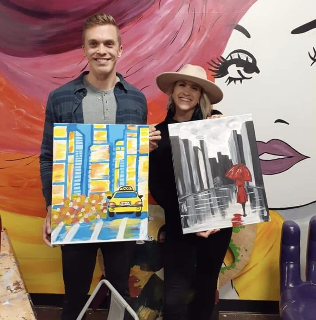A man and woman are standing indoors, each holding a colorful painting of birch trees with vibrant backgrounds. The man is on the left, wearing a dark t-shirt, and the woman is on the right, wearing a gray top. They are smiling and standing in front of a wall with a large, rainbow-colored butterfly mural.