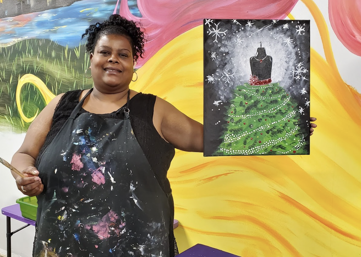 A woman standing in front of a colorful mural, holding a painting of a decorated Christmas tree topped with a black mannequin torso and surrounded by white snowflake designs.